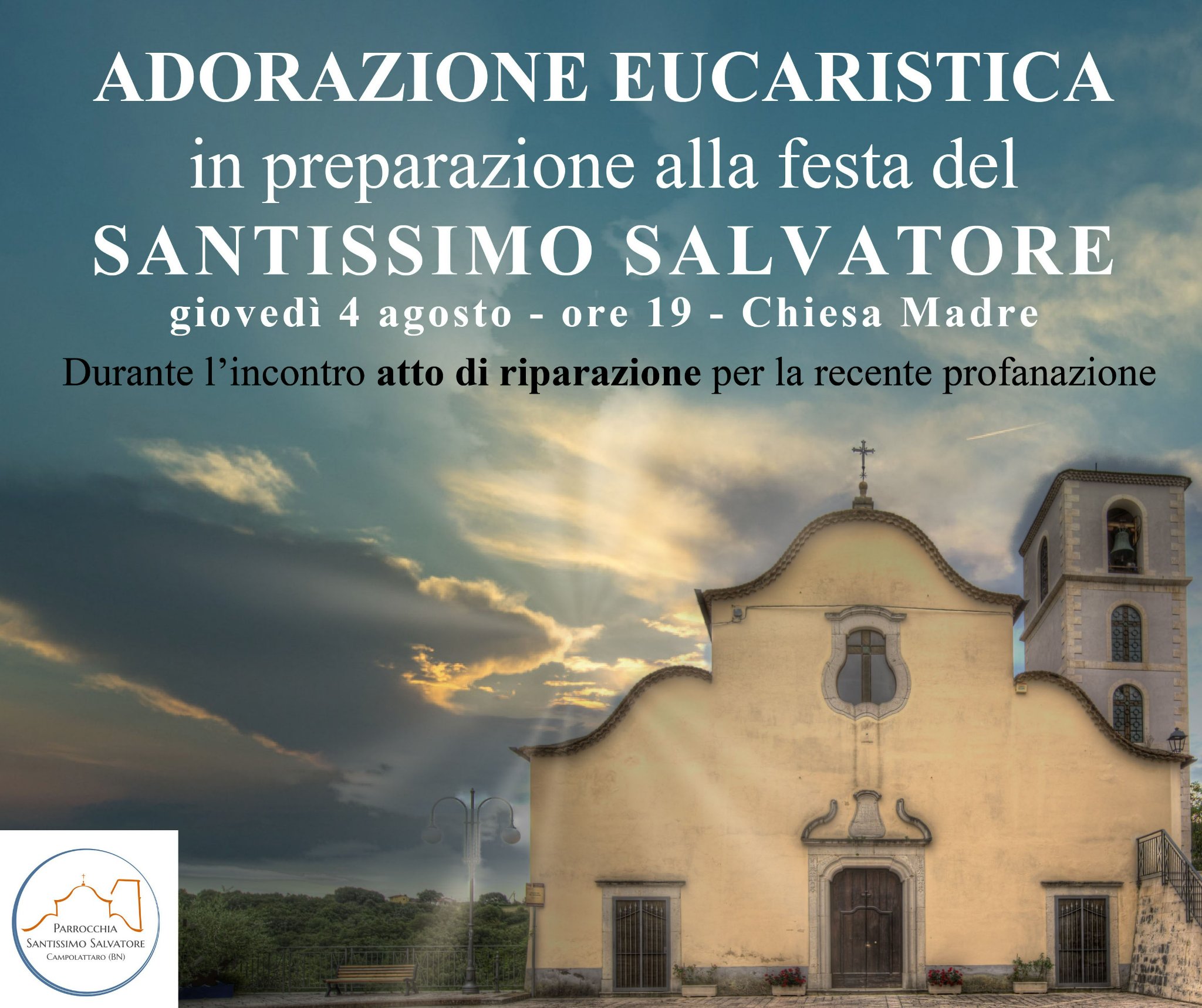 In preparazione alla festa del SS. Salvatore, giovedì 4 agosto, ore 19, siete tutti invitati a partecipare all’Adorazione eucaristica che si terrà presso la chiesa madre. Sarà questa l’occasione per rivolgere al Signore una sentita preghiera in riparazione alla recente profanazione verificatasi al cimitero.
