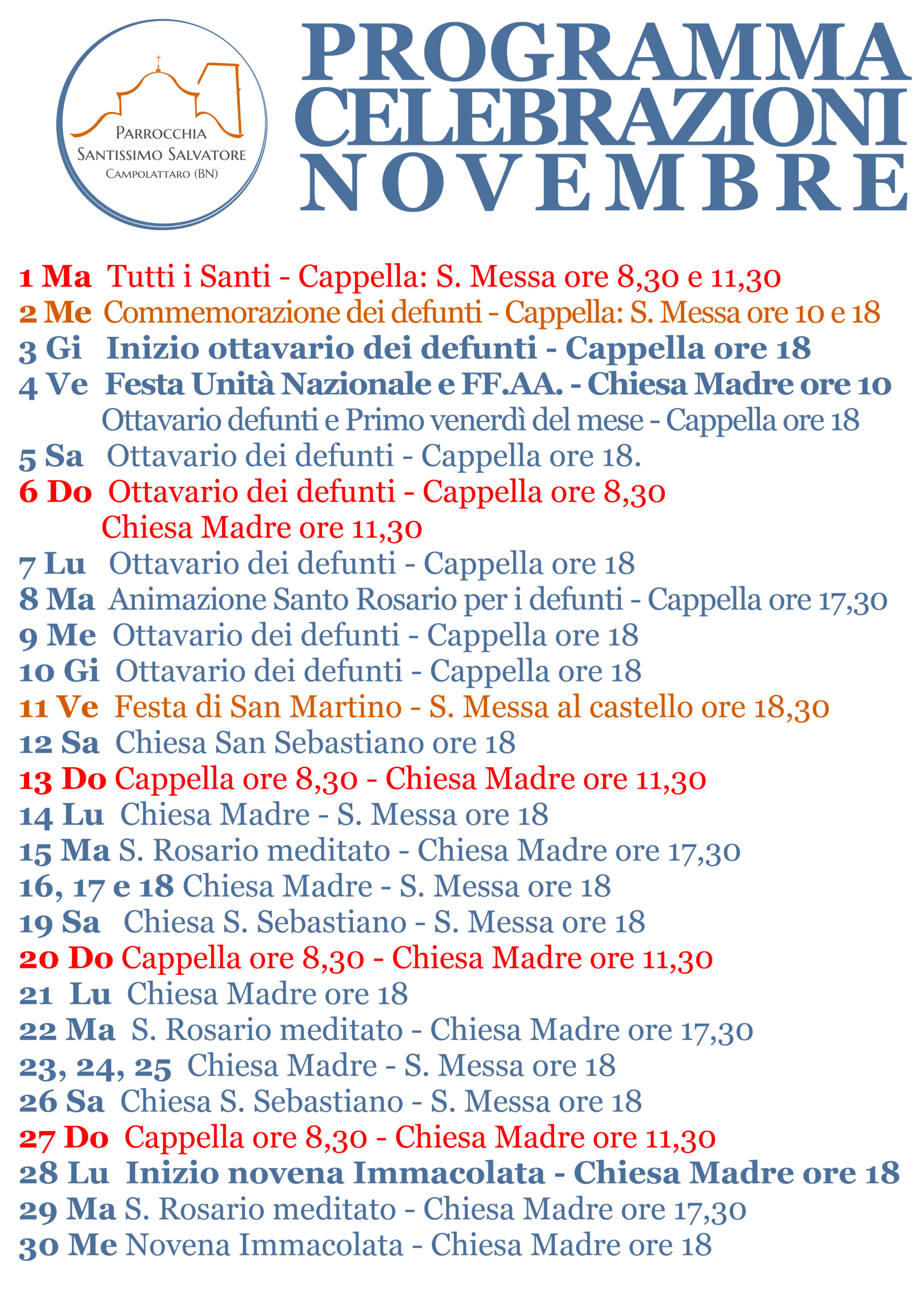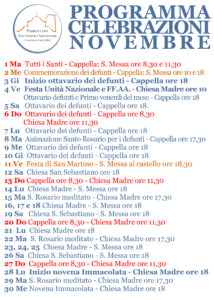 Si invita a prendere visione del calendario delle celebrazioni del mese di novembre, con gli orari delle sante messe e dei luoghi dove si celebra. In tutte le occasioni, mezz’ora prima della S. Messa, recita del Rosario. Grazie a tutti e a presto.