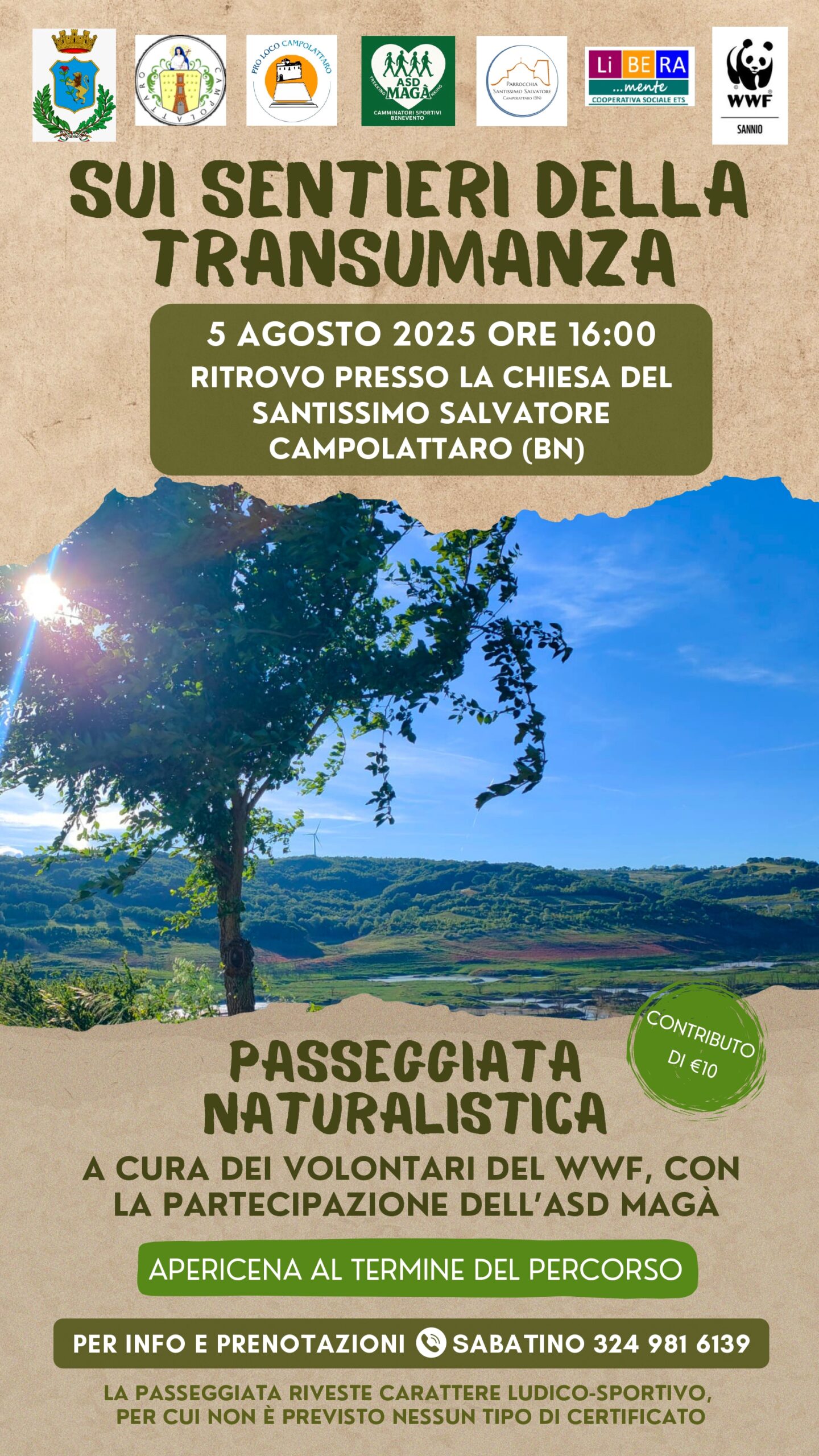 Nell’ambito del programma proposto per i festeggiamenti del SS. Salvatore, la parrocchia di Campolattaro, in collaborazione con i volontari dell’Oasi del WWF e con la partecipazione dell’ASD Magà, propone una passeggiata naturalistica sui sentieri della transumanza.