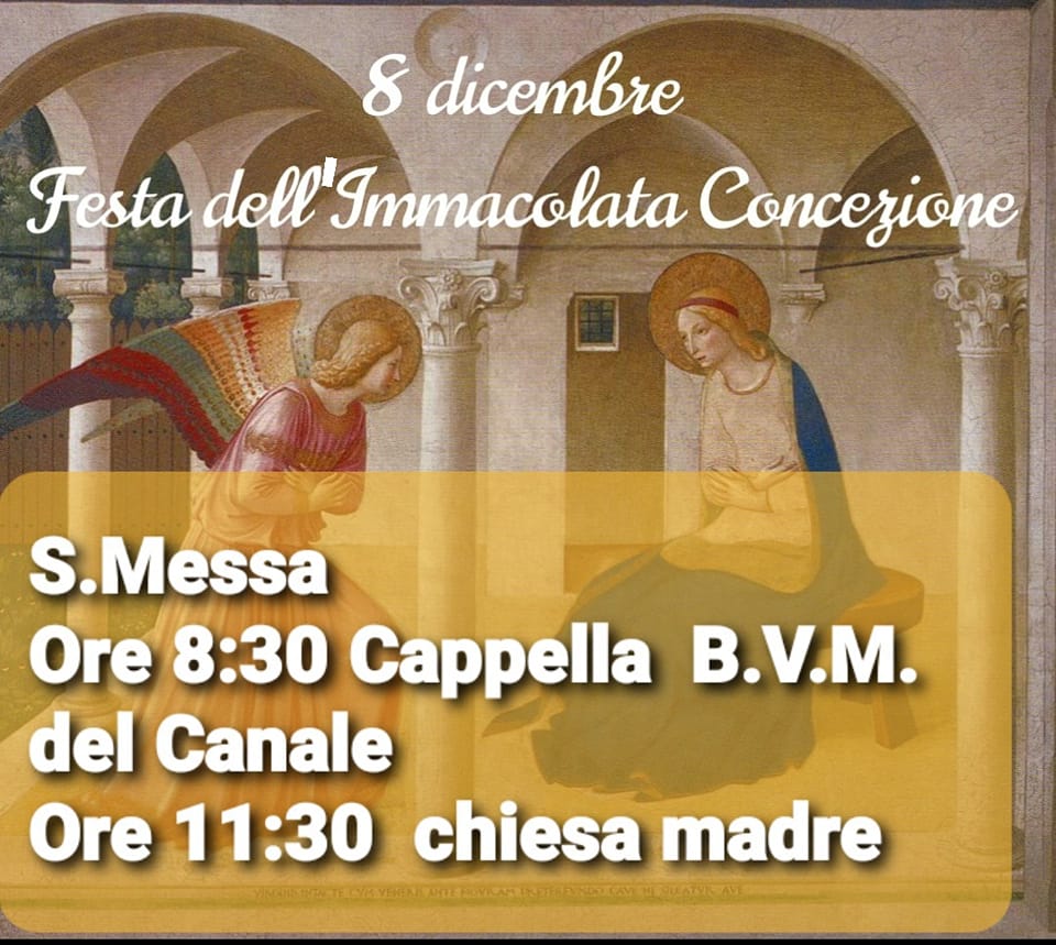 In occasione della solennità dell'Immacolata Concezione, giovedì 8 dicembre, le celebrazioni liturgiche seguiranno il programma festivo e, quindi: ore 8,30 S. Messa presso la Cappella della Madonna del Canale ore 11,30 S. Messa presso la Chiesa del SS. Salvatore